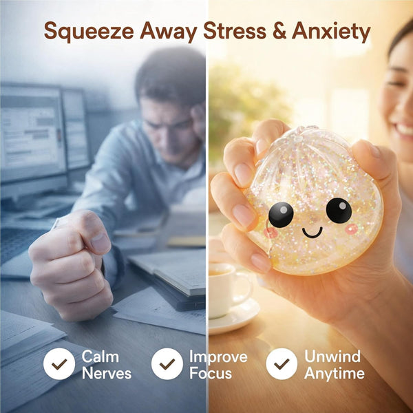 Squeeze the slow-rise glitter dumpling for immediate tactile relief. Feels soft and responsive, calming nerves after tough calls or long tasks to restore focus and reduce tension quickly.